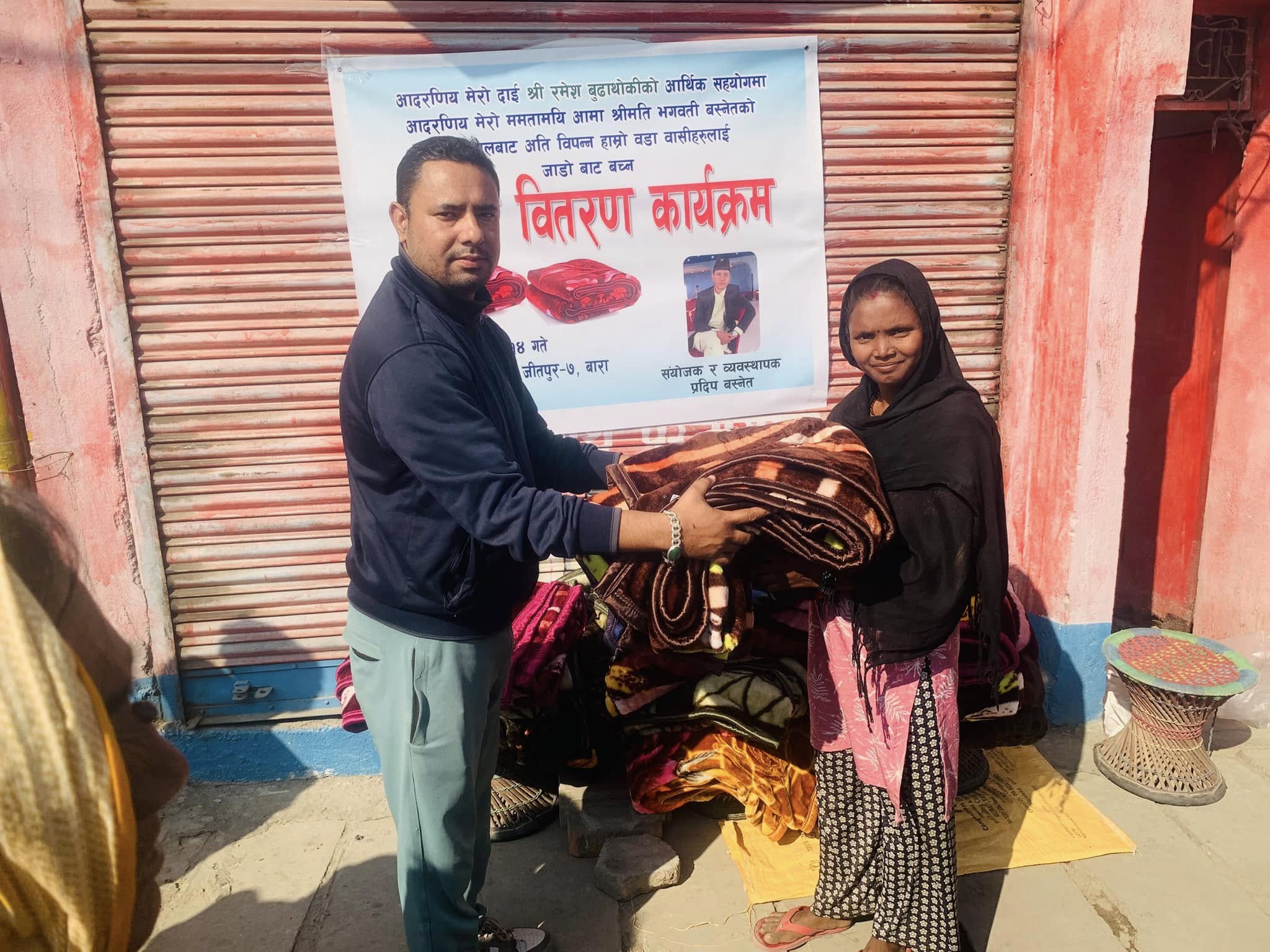 चिसो बढेसंगै बाराको जितपुरमा एक युवाले गरिब तथा विपन्न परिवारलाई न्योनो कम्बल वितरण गरेको छ । बाराको जितपुरसिमरा उपमहानगरपालिका वडा नम्बर ७ जितपुरका प्रदिप बस्नेतको परिवारले करिब २० जना करिब परिवारलाई न्यानो कम्बल वितरण गरेको हो ।
