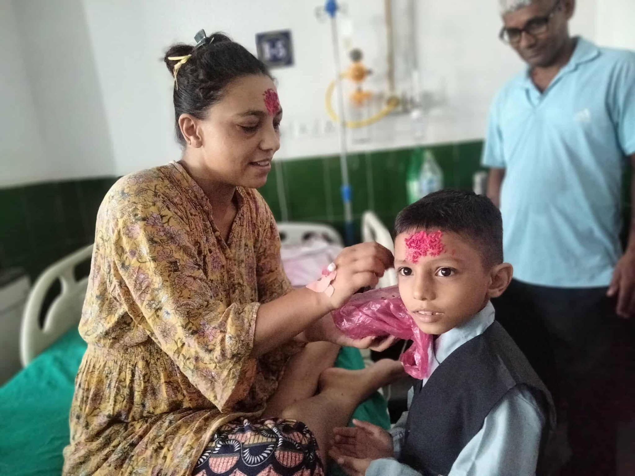 अस्पतालमा रहेकी आमासँग ८ वर्षका शाश्वत आचार्यले बेडमै पुगेर टीका लगाए । सधैँ सँगै खेल्ने र बस्ने उनी आमा भर्ना भएसँगै ठूलोबुवा आमासँग बाहिर बसेका छन् । आमासँग टीका लगाएर एकछिन बेडमा उनी घर फर्किए ।